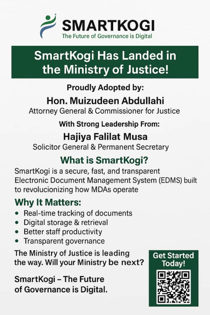 SmartKogi, a purpose-built Electronic Document Management System (EDMS), has become the Ministry’s central hub for filing and processing all documents electronically. With this move, the Ministry of Justice becomes a pacesetter in the state’s digital transformation agenda, proving that public institutions can be efficient, secure, and responsive in the 21st century.